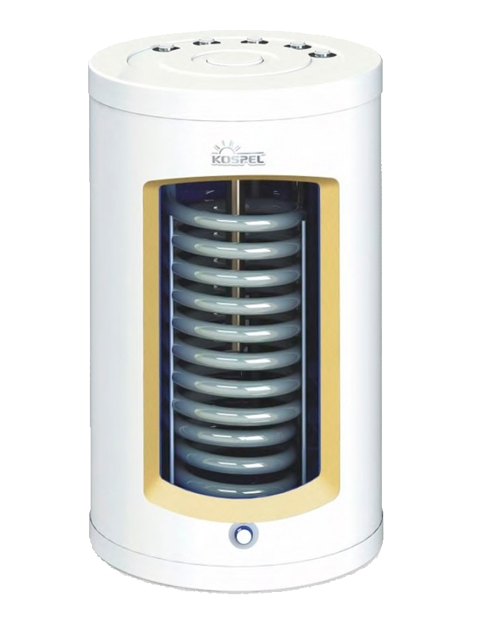 Вертикальный бойлер для нагрева и хранения воды Kospel SWK TERMO TOP со спиральной конструкцией змеевика, а также верхним расположением патрубков для монтажа под настенным отопительным котлом. Теплообменники данной модели идеально подходят для нагрева воды при взаимодействии с отопительным котлом.