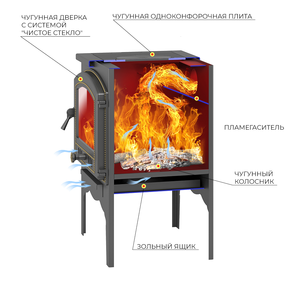 - Экономия топлива: Благодаря системе контроля подачи воздуха, одна порция дров может гореть до 8 часов, что значительно сокращает расходы.
