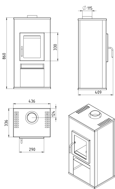 Эта компактная пристенная печь идеально подходит для обогрева небольшого помещения площадью 30-60 м2. Плоская дверка высотой 330 мм. Размер поленьев 25 – 27 см. Подсоединение к дымоходу сверху.
