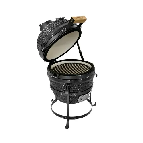 Верхние и нижние вентиляционные отверстия позволяют управлять поступающим потоком воздуха для поддержания желаемого жара. Верхний элемент дымоотвода выполнен из чугуна. Керамическая чаша с колосником для древесного угля располагается в основании гриля. На чашу устанавливается высокопрочная нержавеющая стальная решетка. Гриль оборудован термометром, который помогает следить за температурным режимом. Бамбуковая ручка и столешницы делают эксплуатацию гриля максимально удобной и практичной.